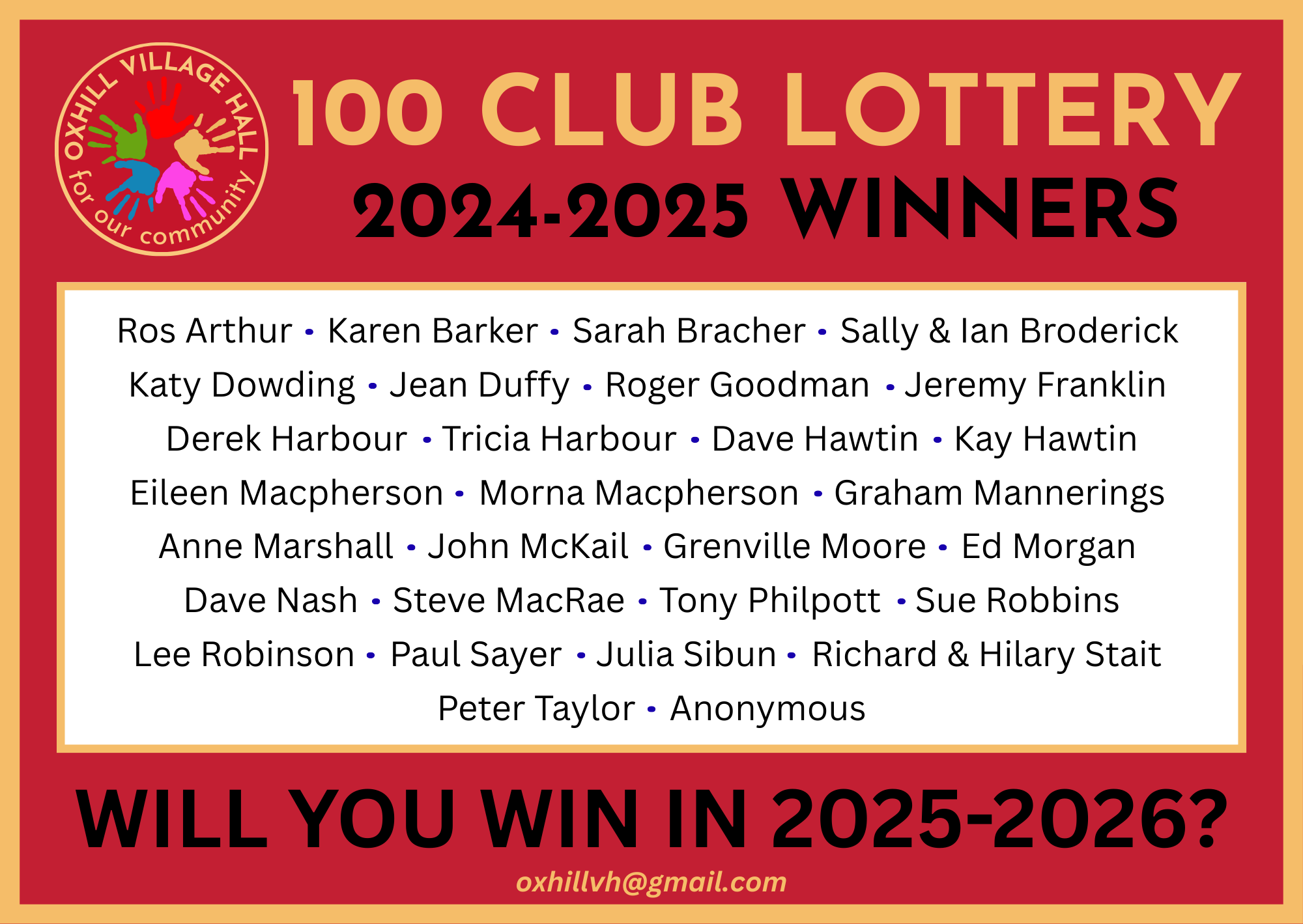 Launched in September 2024, the '100 Club' gives subscribers the chance to win a monthly lottery while supporting Oxhill Village Hall. Our '100 Club' is managed by Sally Mannerings. To reach Sally, please email oxhillvh@gmail.com.